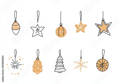 Golden Christmas decorations on a white background with festive ornaments