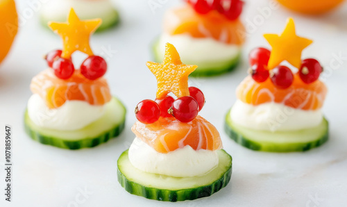 Festive cucumber and salmon appetizers shaped like Christmas trees
