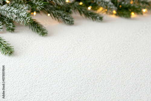 Festive holiday garland with Christmas lights on a gentle blurred white background