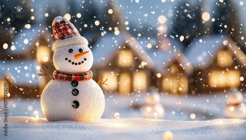 Powdery snowfall gently blankets a cozy winter village during sunset