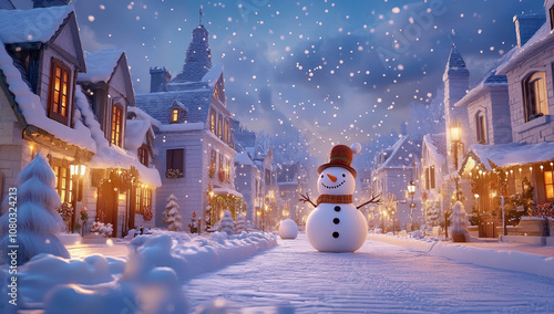 Cheerful snowman in winter village with festive holiday lights and snow falling