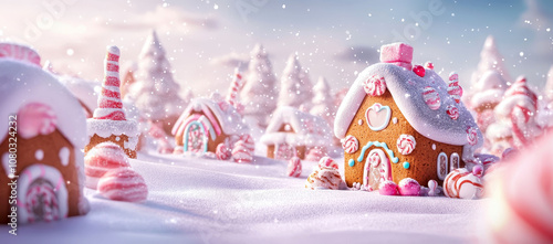 Colorful candy village in a snowy Christmas countryside with festive decorations