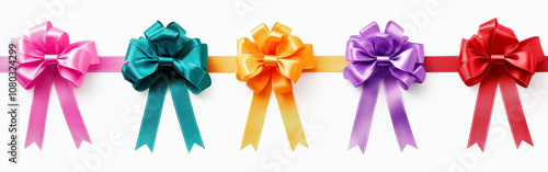 Five colorful christmas gift ribbons with bows isolated on a white background