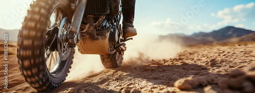 Close-up of motorcycle tire kicking up dust on a sandy road