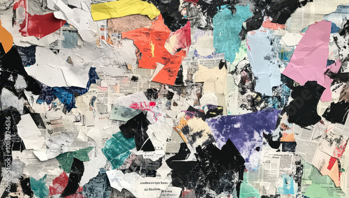 Colorful collage of torn newspaper clippings and artistic illustrations
