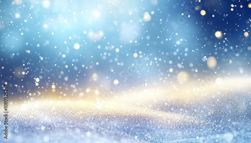 Elegant abstract background with golden bokeh lights and white snowflakes