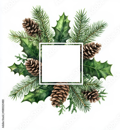 Watercolor Christmas wreath with holly leaves and pine cones