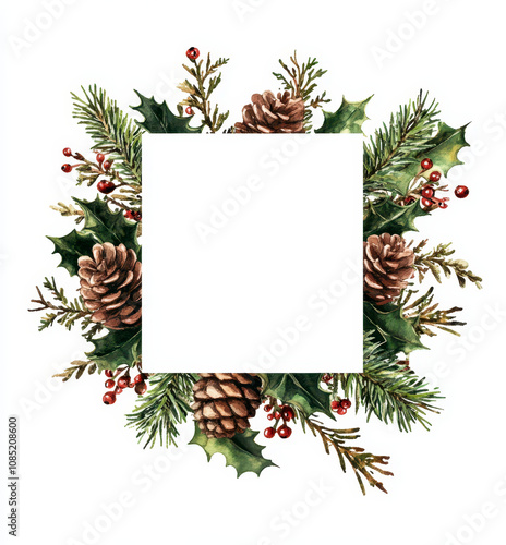 Watercolor Christmas frame with holly, pine branches, and berries