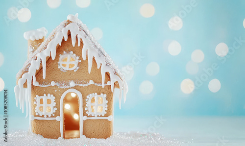 Delightful gingerbread house with icing against a sparkling backdrop