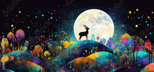 Magical landscape with a deer under a full moon sky