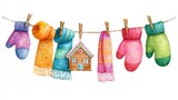 Watercolor Mittens Scarves And Gingerbread House Hanging On Clothesline Isolated On White Background For Winter Holiday Designs And Decorations