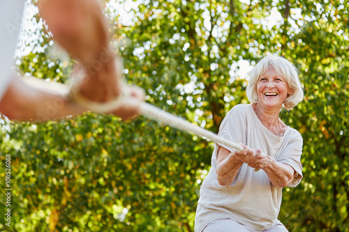 Fröhliche Seniorin beim Tauziehen