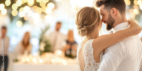 Couple dancing in elegant setting under romantic lights at event