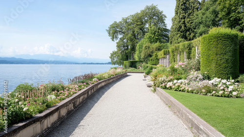Scenic view of garden path by a calm lake