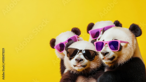 Cheerful panda family wearing sunglasses on a bright yellow background