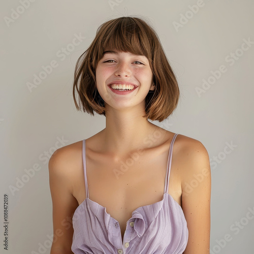 Portrait of a smiling teenage girl with pink hair and freckles on a green background