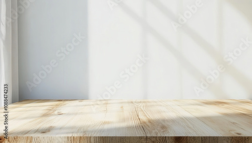 Empty light wood table against a white wall with natural shadows