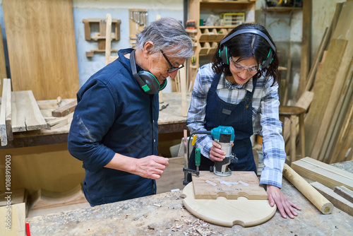 Experienced craftsman teaching young apprentice in a woodworking shop