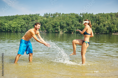 Glückliches Paar bespritzt sich mit Wasser