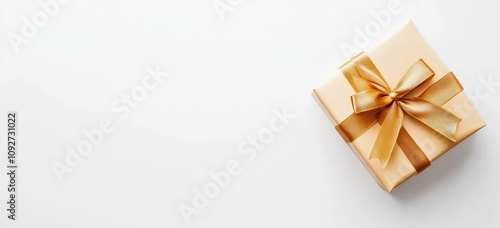 Golden bow and ribbon on white box on red background as Christmas gift concept