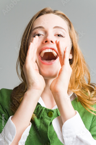Joyful teenage girl with wavy sandy hair in blue dress expressing happiness and excitement against a tan background