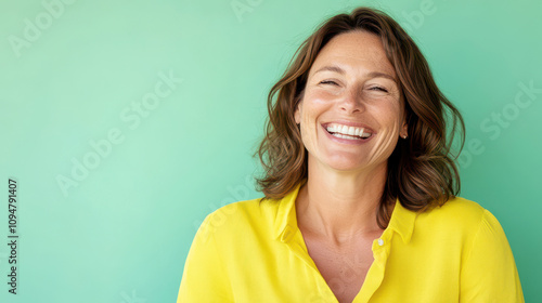Portrait of a laughing Hispanic woman in her 50s with medium-length hair against a green background, radiating joy and positivity.