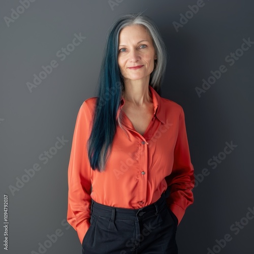 Portrait of a visionary Northern European woman in her 40s, confident and stylish in a vibrant orange shirt