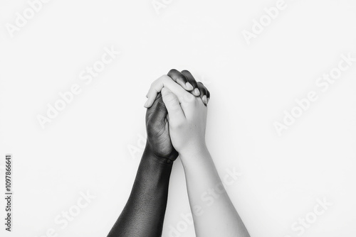 Black and white photograph of two hands clasped together in unity