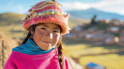 Smiling Peruvian girl in traditional attire with scenic Andean village backdrop