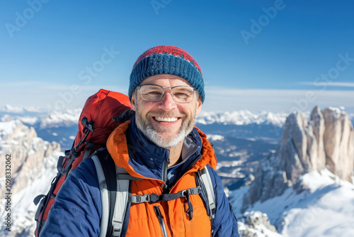 Happy man wearing bright gear in snowy mountain surroundings