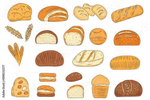 Variety of bread types hand drawn doodle art illustration