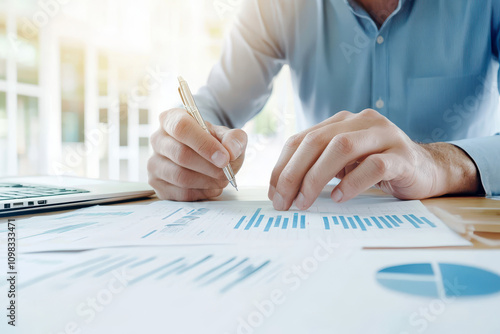 Businessman reviewing financial documents at desk in modern office