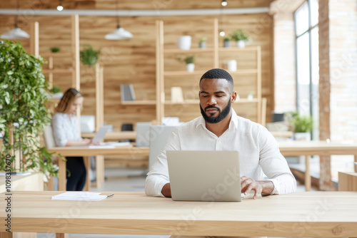 Smiling handsome entrepreneur working on laptop with documents in modern office space. Confident businessman enjoying his workday in a bright, organized environment.
