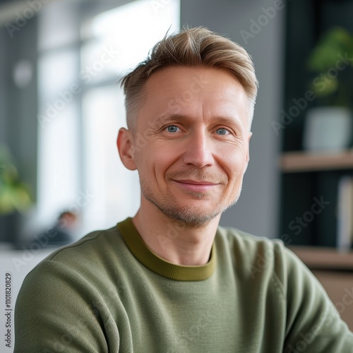 Portrait of a smiling Swedish environmental planner at work with a friendly demeanor