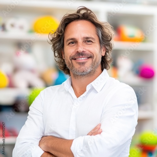 Confident middle-aged businessman smiling in modern office setting