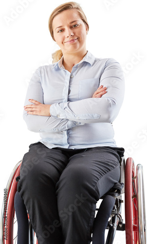 Frau im Rollstuhl im behindertengerechten Bürohaus