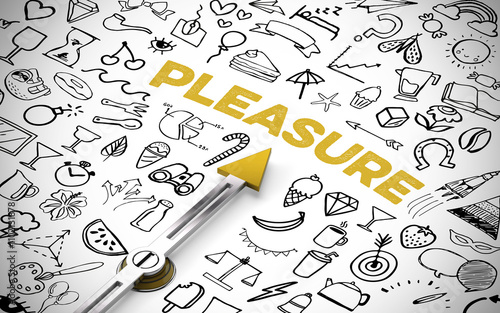 Kompass zeigt auf Schriftzug „Pleasure“ zwischen Icons