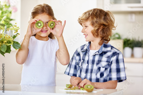 Zwei Kinder schneiden Kiwi in Küche