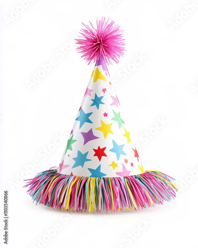 Colorful birthday party hat with stars and pink fringes