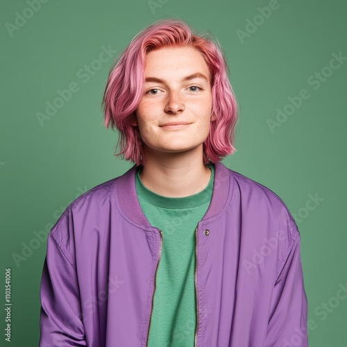 Cheerful senior woman in her 80s with cropped copper hair smiling warmly against a purple background