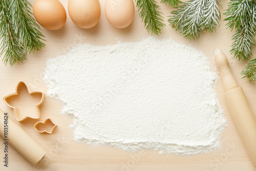 Festive baking scene with cookie shapes, flour mound and cracked egg shell