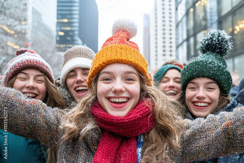 Young friends joyfully celebrating Christmas with festive attire outdoors