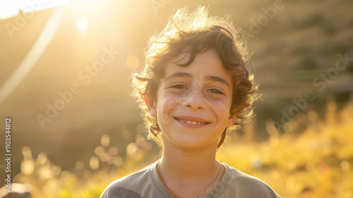 Warm sunset portrait of a smiling French boy in nature, feeling happy and carefree