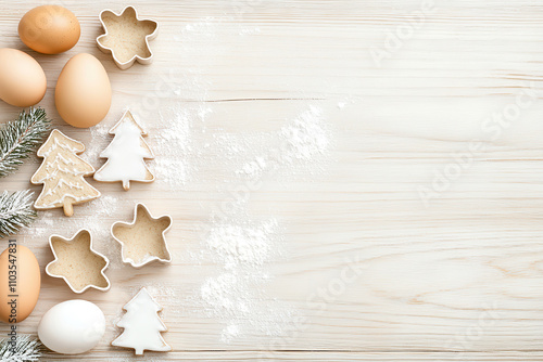 Festive baking scene with cookie shapes, flour mound and cracked egg shell