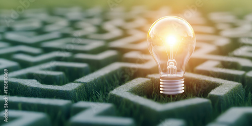 Illuminated light bulb at the center of a complex green maze