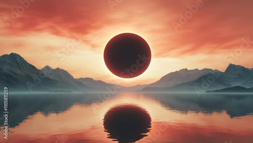 Serene sunset with dark sun reflecting over calm lake