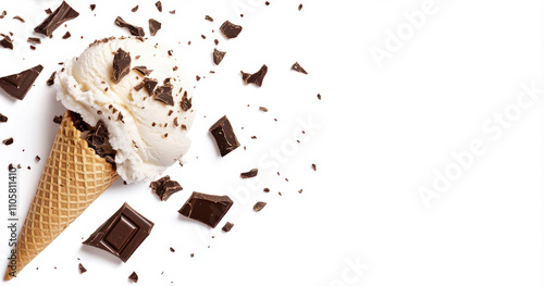 Top view of chocolate brownie ice cream scoop with chocolate sauce isolated on white background