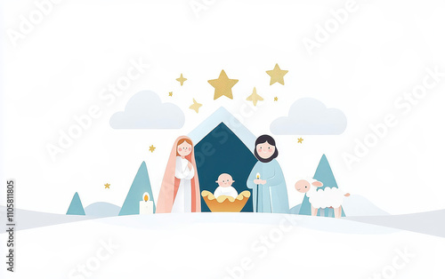 Illustration of nativity scene with baby Jesus and serene family