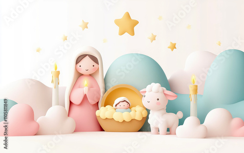 Whimsical nativity scene with Mary, baby Jesus, and sheep