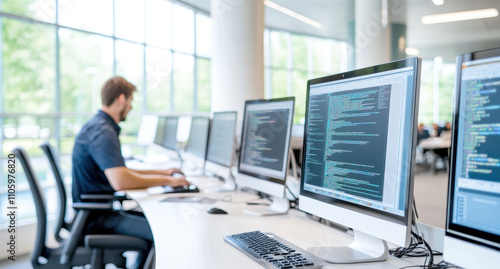Teacher engaging with students in a modern computer lab environment